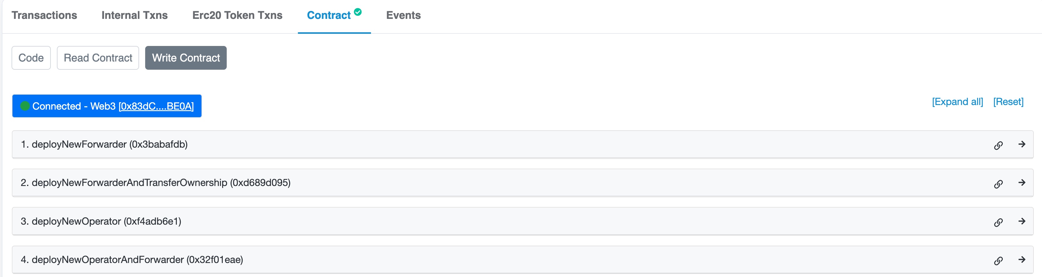 • The owner of a forwarder contract is an operator contract. The owner of the operator contract is a more secure address, such as a hardware wallet or a multisig wallet. Therefore, node operators can manage a set of forwarder contracts through an operator contract using a secure account such as hardware or a multisig wallet.